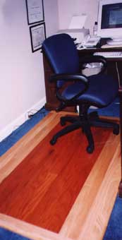 TIP: Wood Floor Protectors A custom-made wood floor protector is a nice distinctive alternative to the clear plastic mats. The beveled edges make an easy transition to your floor surface. Custom made of prefinished and stained natural topaz. Can be made according to your specifications. |
